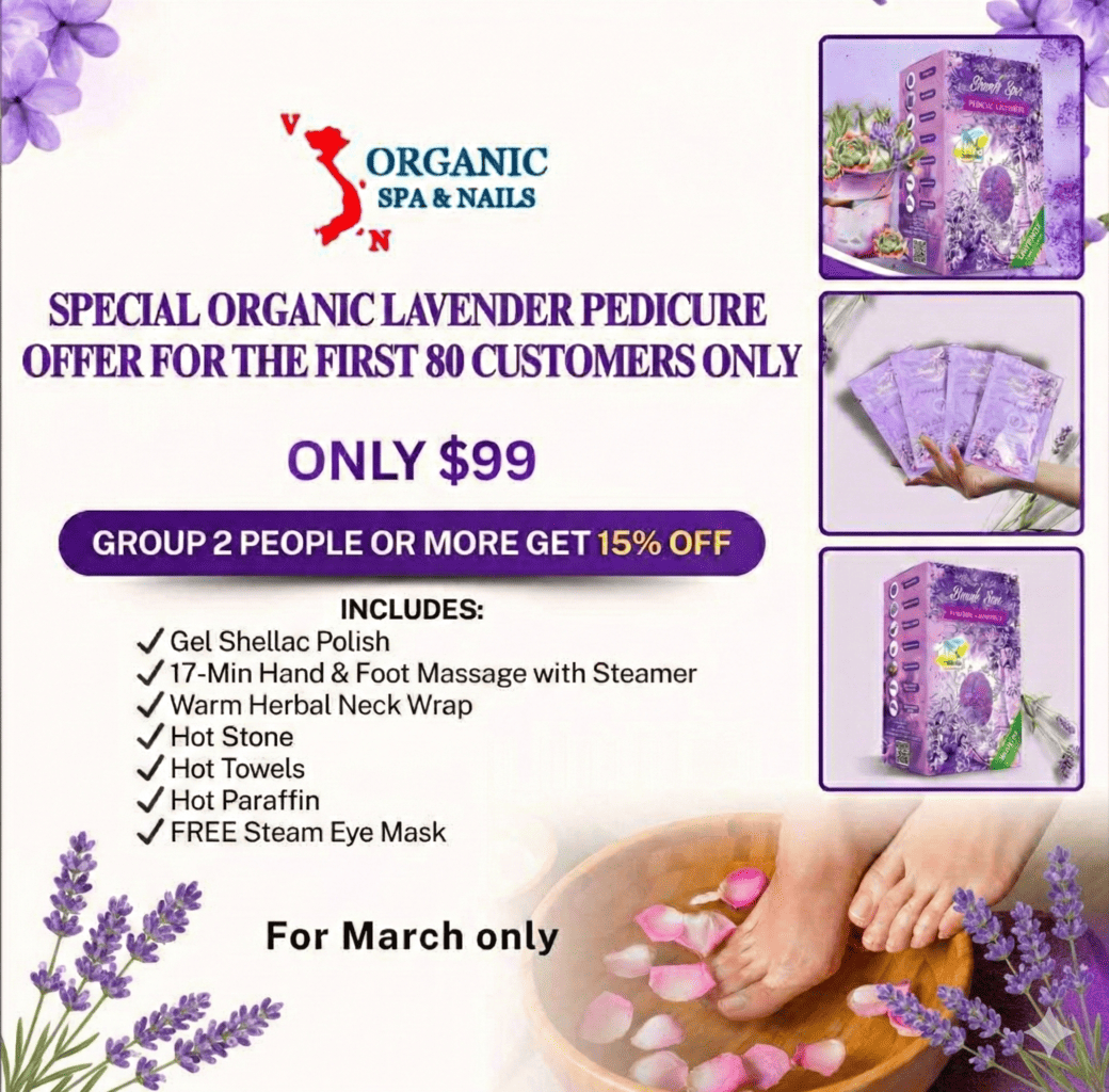 Treat yourself to our Special Organic Lavender Pedicure, designed to relax, soften, and refresh. This limited-time package is available for March only and limited to the first 80 customers.